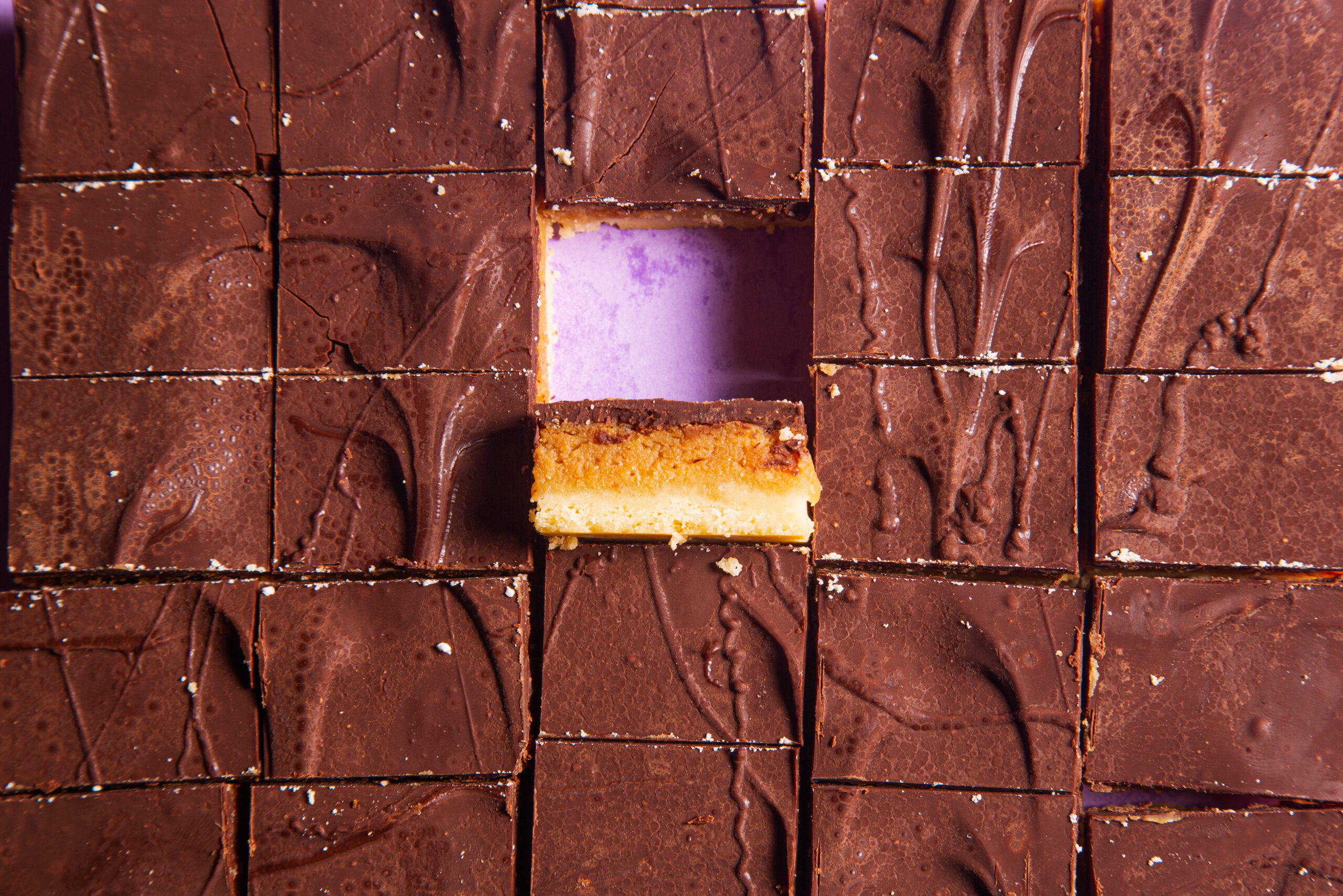 Caramel sandwiched between shortbread and chocolate.